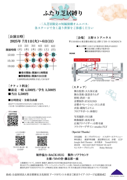 2025年7月1日(火)〜6日(日)、上野ストアハウスにて、短編演劇オムニバス公演『ふたり芝居縛り』を上演します。本作では、登場人物は「2人のみ」という縛りのもと、1つひとつまったく異なる世界観を描き、観客を新たな物語の入り口へと誘います。