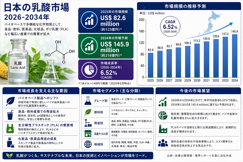 IMARCグループが発表した最新レポート「日本の乳酸市場:業界動向、シェア、規模、成長、機会、予測2026-2034」によると、日本の乳酸市場規模は2025年に8,260万米ドルに達しました。IMARCグループは今後、市場規模は2034年までに1億4,590万米ドルに達し、2026年から2034年にかけて年平均成長率(CAGR)6.52%で成長すると予測しています。