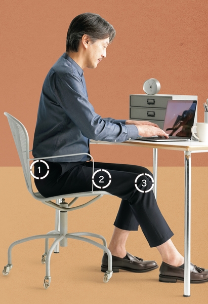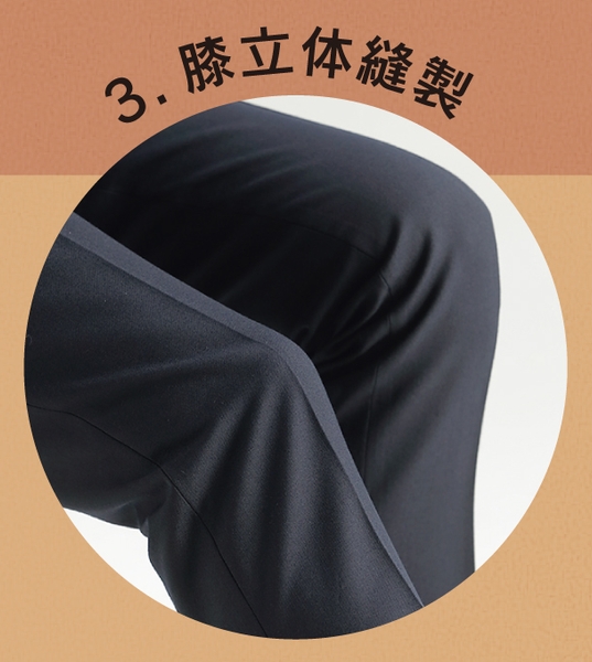 さらに、腰部の後ろ側にアクションプリーツ(特許第6746822号)を取り付けており、着席姿勢に合わせてプリーツが広がることでヒップ部に感じやすい生地の張りを軽減する他、膝部にゆとりを持たせる立体縫製を取り入れることで着用感を向上させています。