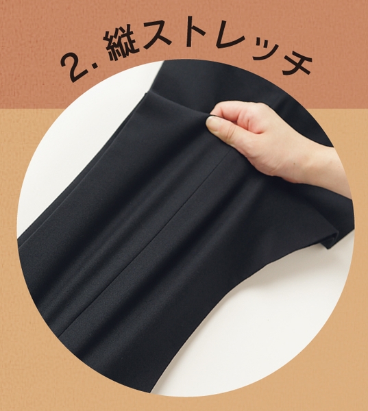 一般的なウール/ポリエステル混紡生地を使用した商品は、“横方向”へのストレッチ性が主流ですが、今回企画した『すわりシゴト専用パンツ』に使用する生地は独自の織り・仕上げ技術により、ウール/ポリエステル混紡生地でありながら“縦方向”に約14%のストレッチ性を実現しました。これは当社従来品と比べて約1.4倍のストレッチ性となり、着席時の下半身の窮屈感を緩和します。