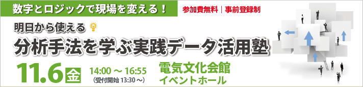 2015年10月14日 11:00株式会社アシスト(本社:東京都千代田区、代表取締役社長:大塚 辰男、略記:アシスト)は、実践的なデータ活用ノウハウと実際の企業における情報活用事例を紹介するセミナー「数字とロジックで現場を変える! 明日から使える分析手法を学ぶ実践データ活用塾」を11月6日(金)に名古屋市にて開催することを発表します。