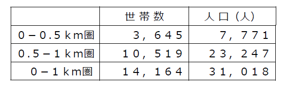 ・店舗から1km圏内は単身世帯比率が38.4%、2人世帯比率は26.6%と全体の6割強が少人数世帯です。