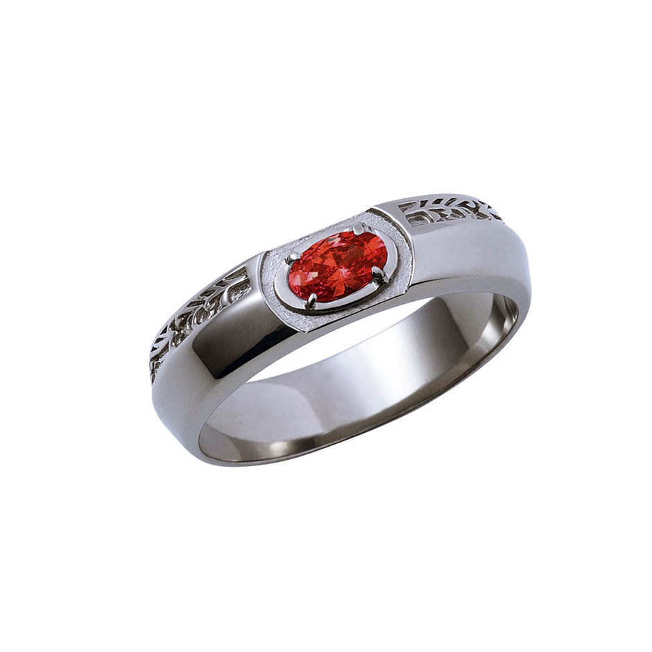 石川の指環(刃)は上品なブラックコーティングを施したナイフエッジの型に、オーバルカットのイメージカラーストーンを配しました。存在感がひき立つデザインです。