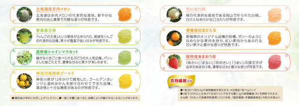フレーバーは全7種。今回、青森産王林、岡山産白桃、愛媛産紅まどんな、神奈川産湘南ゴールドが仲間入り。それぞれの果実のおいしさをじっくりと引き出し、濃厚でジューシーなゼリーに仕上げました。素材の持つみずみずしくフレッシュな味わいをご堪能いただけます。