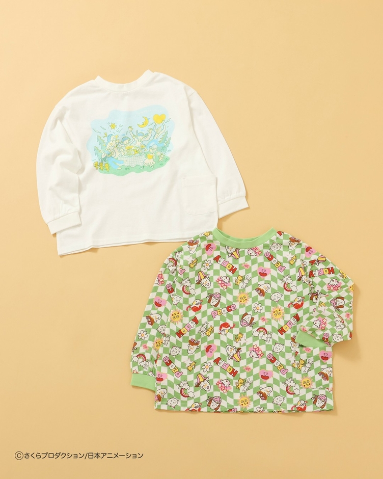 グリーンはパンツとおそろいのデザイン、オフホワイトはさまざまなキャラクターモチーフをぎゅっと詰め込んだ贅沢なデザイン。どちらを前にしても着られる2WAYタイプなので、その日の気分やコーデに合わせて楽しめます。