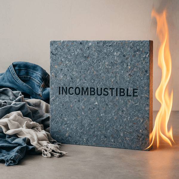 従来、衣類などの繊維から再生された素材は、環境にやさしく意匠性も高い一方で、火炎暴露に対する耐性が十分とはいえず、防火性能の確保が課題とされてきました。