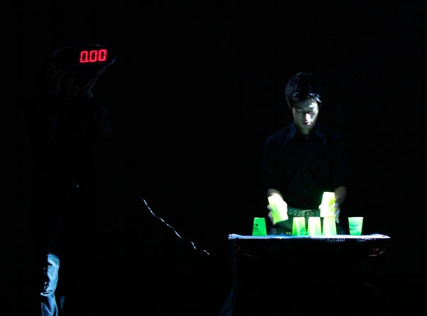 9個のカップを使用。伏せて3個重ねた3組のカップを1組ずつピラミッド状に重ね終わったら、最初に戻り、同じ順番で1組ずつ崩して、元のように3-3-3に重ねた型に戻す。