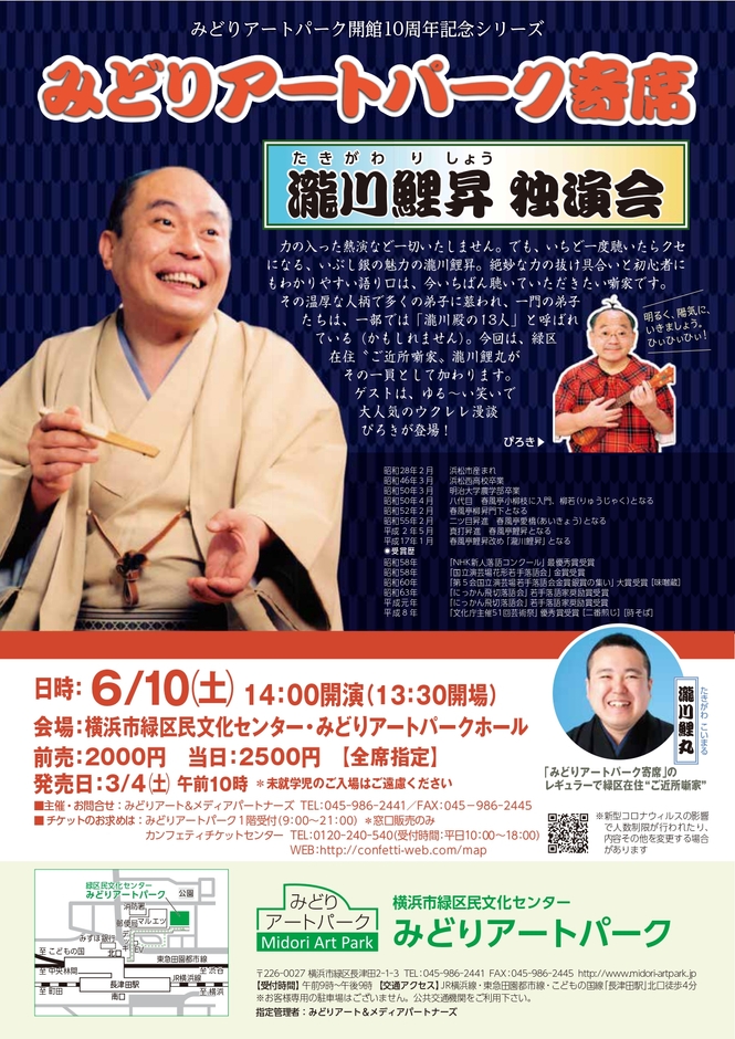 みどりアートパーク開館10周年記念シリーズ『みどりアートパーク寄席 瀧川鯉昇独演会』が2023年6月10日(土)に横浜市緑区民文化センター・みどりアートパークホール(神奈川県横浜市緑区長津田2丁目1-3)にて開催されます。
