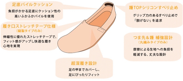 商品仕様:履き口ストレッチテープ、足底タオルタッチ生地、かかとすべり止め付