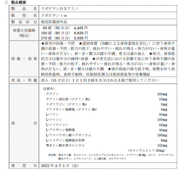これまで「リポビタン」ブランドは、「疲労の回復・予防」などを効能とした医薬品および医薬部外品のドリンク剤を中心に、錠剤タイプ(医薬部外品)や、エネルギー摂取しやすいゼリー飲料(食品)など、剤形やカテゴリーにとらわれない20種類を超える様々な製品をラインアップし、毎日を健康に明るく過ごしたい方のニーズに合わせて選んでいただけるブランドとして、生活者の皆さまの日々の生活をサポートしてまいりました。