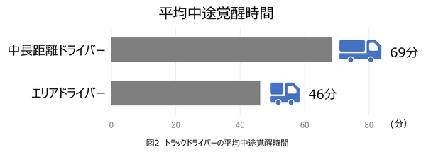 さらに、トラックドライバーの中途覚醒時間について、解析を行いました。中途覚醒時間は睡眠中に目が覚めて起きている時間を示しています。中長距離トラックドライバーは、中途覚醒時間が平均69分であり、エリアドライバーの中途覚醒時間は平均46分でした(図2)。本調査結果において、エリアドライバーよりも中長距離トラックドライバーの方が、中途覚醒時間が長いことが分かりました。