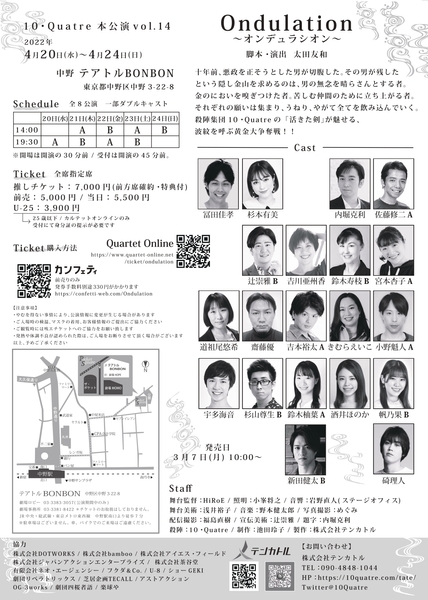 10・Quatre(東京都練馬区、代表:内堀克利)主催、10・Quatre 本公演vol.14『Ondulation ~オンデュラシオン~』が2022年4月20日 (水) ~2022年4月24日 (日)にテアトルBONBON(東京都中野区)にて上演されます。チケットはカンフェティ(運営:ロングランプランニング株式会社、東京都新宿区、代表取締役:榑松 大剛)にて発売中です。