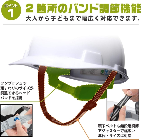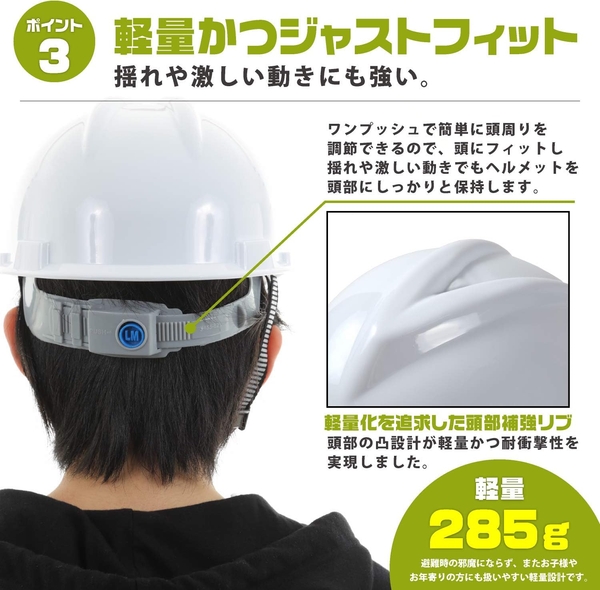 防災ヘルメットは、衝撃吸収性を高めるためのクッション性と、長時間の使用でもムレを軽減する通気性を考慮したデザインが特徴です。ヘッドバンドと顎下ベルトの二箇所で調整でき、頭部にしっかりとフィットするため、揺れや激しい動きにも強いです。また、わずか285gという軽量さで、女性や高齢者にも扱いやすい設計となっています。