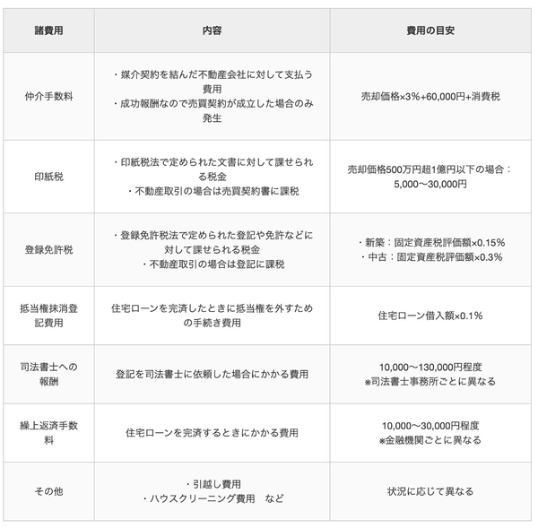 取得や売却にかかる諸費用の内訳