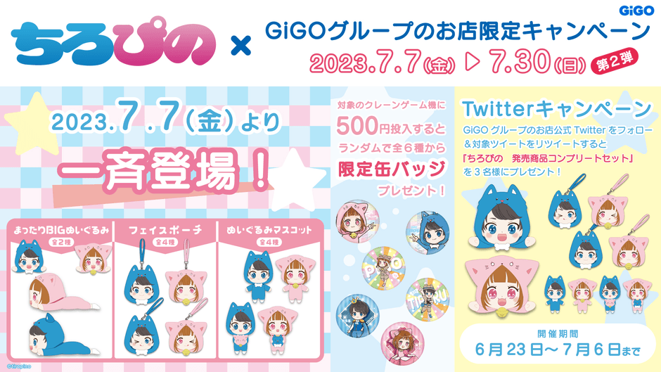 株式会社GENDA GiGO Entertainment(本社:東京都港区 代表取締役社長:二宮 一浩 以下当社)は、2023年7月7日(金)より、GiGOグループが運営する店舗にて、YouTubeで活動中のちろる・ぴの 男女2人のゲーム実況グループ『ちろぴの』とコラボレーションした限定企画を開催いたします。