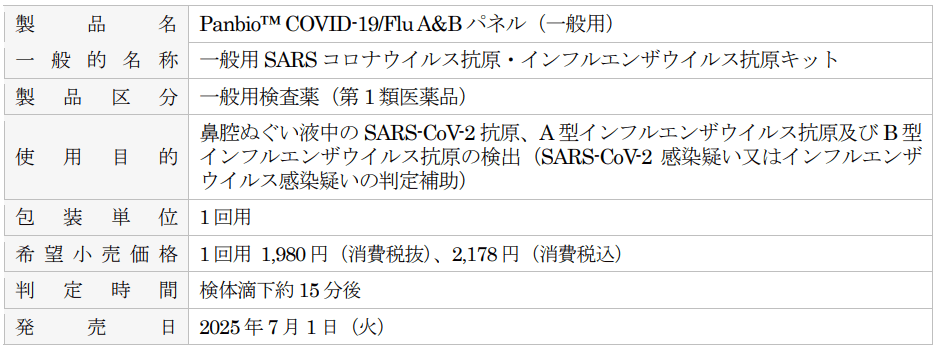 大正製薬株式会社[本社:東京都豊島区 社長:上原 茂](以下、当社)は、新型コロナウイルス感染症とインフルエンザの一般用抗原検査キット(OTC)「Panbio™ COVID-19/Flu A&Bパネル(一般用)」(以下、本キット)を2025年7月1日(火)より発売いたします。