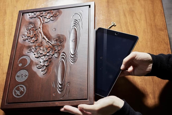 プログラムのはじめに、デジタル機器を預かります。デジタル機器を格納する箱は、長野県伝統工芸品「軽井沢彫」の文箱です。軽井沢彫は、避暑地・軽井沢に別荘を建てた宣教師や外交官に向けて、西洋家具の形式に日本古来の技法を融和させたことがきっかけに誕生しました。軽井沢ならではの文箱にデジタル機器を収め、デジタルの存在から離れることで、より印象深い滞在へと導きます。