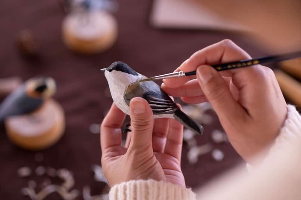 冬の軽井沢にて、木の温もりに触れる、野鳥の木彫り体験を用意しました。野鳥の森に隣接するバードキャビンでは、冬限定で野鳥を目の前で観察できます。先ずは、窓越しに訪れる野鳥を観察し、その姿をスケッチします。その後、星のや軽井沢の敷地内にある「茶屋」へ移動します。窓の外に冬景色が広がり、静寂に包まれる1組限定の貸し切り空間です。白樺や栗の木など好みの木材を選び、スケッチした絵と、自身の目で見た野鳥の姿や表情、仕草を思い出しながら、少しずつ野鳥の形へと彫っていきます。彫るたびに、ほのかに香る木材の香りや、表情を変える木材の手触りを通して、時を忘れて没頭できる体験です。講師のサポートのもと行うため、初心者でも安心して行えます。木彫りを終えたら、次は色を重ね、観察した野鳥の毛並みや色合いを絵付けします。完成した作品は、思い出の品として持ち帰れます。