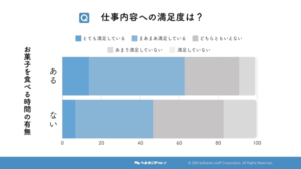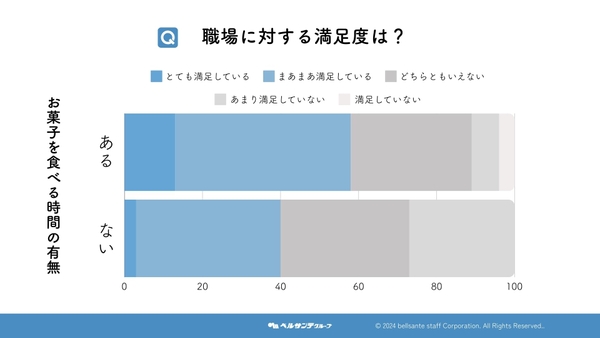一方で「就業時間内にお菓子を食べる時間がない」と回答した人のうち、「職場に満足している」と回答した人は40.0%に留まり、「満足していない」と回答した人は26.7%に上りました。