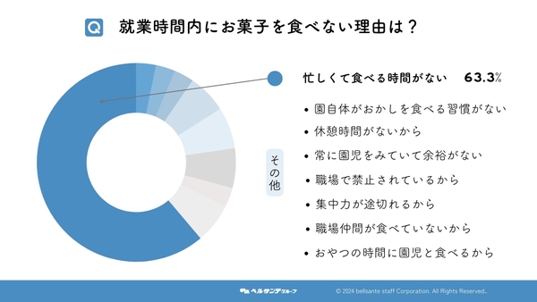 「就業時間内にお菓子を食べる時間がない」と回答した人にお菓子を食べない理由を質問したところ、「忙しくて食べる時間がないから」と回答した人が63.3%を占めました。