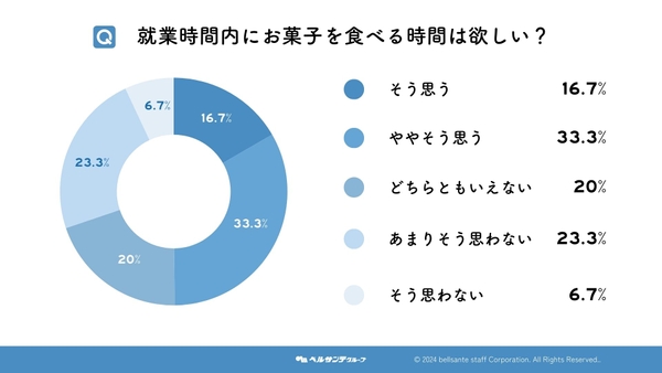 「就業時間内にお菓子を食べる時間はありますか?(休憩時間を含む)」という質問に対して、「ある」と回答した人は79.7%を占めました。「ない」と回答した人は20.3%に留まりました。