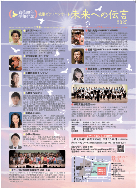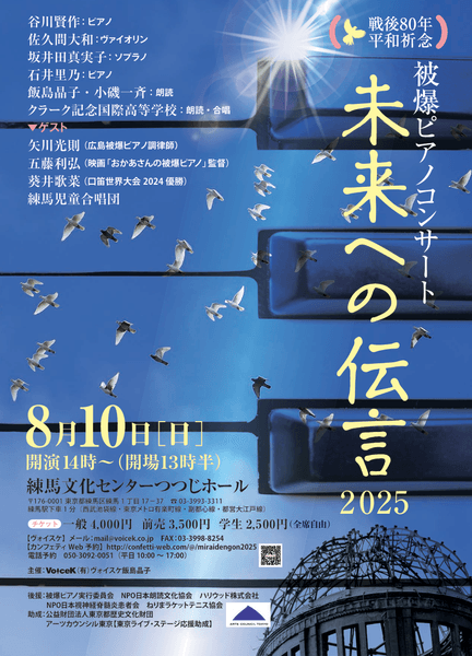 有限会社ヴォイスケ(代表:飯島晶子)主催、被爆ピアノコンサート『未来への伝言2025』が2025年8月10日 (日)に練馬文化センター 小ホール(つつじホール)(東京都練馬区練馬1-17-37)にて開催されます。