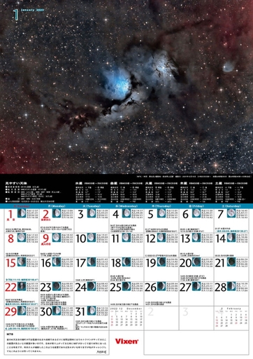 表紙と各月のページには、ビクセンオリジナル天体カレンダー写真コンテストの入賞作品が掲載されています。日付部分には、日の出・日の入り時刻や月の満ち欠けの様子、さらには流星群の極大日といった天文情報が書かれていますから、天体観測や撮影、観望会イベントの計画の際にたいへん役立つカレンダーです。