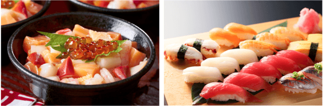 右:ライブキッチンで職人が握る握り寿司は、北海道産水だこや、お子様も大好きなサーモンの炙りがお楽しみいただけます。通常の米酢よりうま味とコクを感じる赤酢を使ったこだわりのシャリと一緒にお楽しみください。