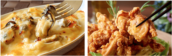 左:帆立と牡蠣のグラタン。冬に美味しさを増す2つの海の幸を