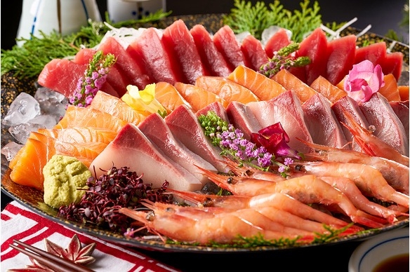 とろりとした食感のサーモンのお造りは見た目も豪華に舟盛りでご提供。