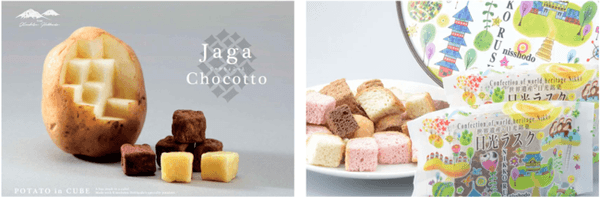 左:北海道代表、「じゃがちょこっと」。北海道・喜茂別町の特産品のじゃがいもをキューブ型に切り出し、真空フライにした、ザクっとした歯ごたえのお菓子です。素材を活かしたナチュラルソルト味と、チョコレートコーティングの2つの味が楽しめます。甘みと塩味のバランスが絶妙で、コーヒーやお茶請けはもちろん、ビールやワインのおつまみにもぴったりな、どなたにも喜ばれるお土産です。