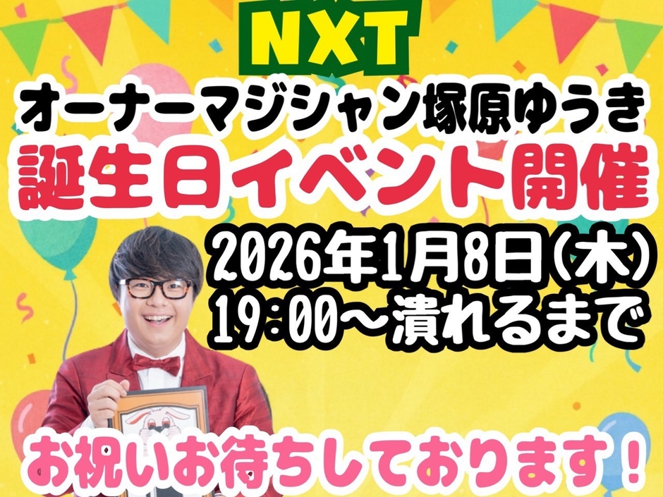 茨城県土浦市にてエンターテインメントバーを運営する「MAGIC BAR NXT(マジックバー ネクスト)」(所在地:茨城県土浦市川口)は、2026年1月8日(木)に、オーナーマジシャン・塚原ゆうきの誕生日を記念した特別イベントを開催いたします。