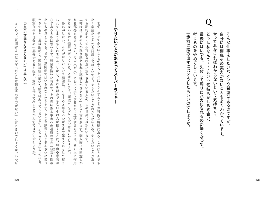 今は少し時代が変わり、幸福の定義や仕事の定義も多様になりました。しかしかつての私と同じように、正解を探して迷い、悩んでいる方たちがいらっしゃるのだなと、SNSで質問を募るたびに思います。自分らしく生きる、自分らしく働く、それってどういうことなんだろう?その答えはきっと、人によって全然違います。だからこそ「こう考えてみるのはどうだろうか」「世の中にはこういう法則があると知っておくのもいいかもね」という対話がスタイルを形作ることもあると思うんです。そこで、自分の経験を通して培ったものを、誰かの疑問にお答えする形でエッセイに綴ってみました。