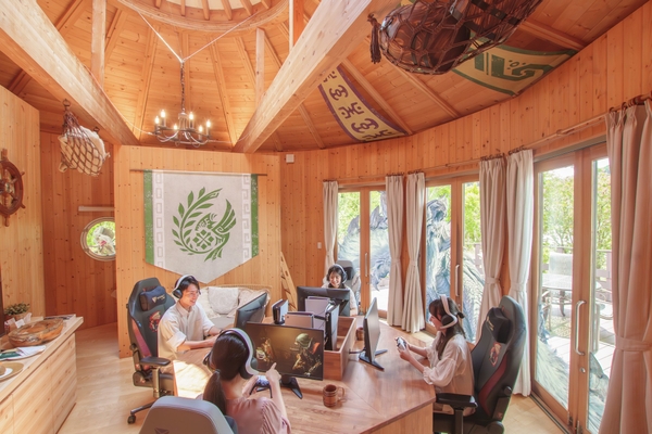 「ニジゲンノモリ」内のグランピング施設「GRAND CHARIOT 北斗七星135°」の一棟を「集会所のコクーン」をテーマに、ゲーミングルームとして装飾。みんなで集まって、ゲームの世界に没頭し、現実でも狩りに出かけよう。