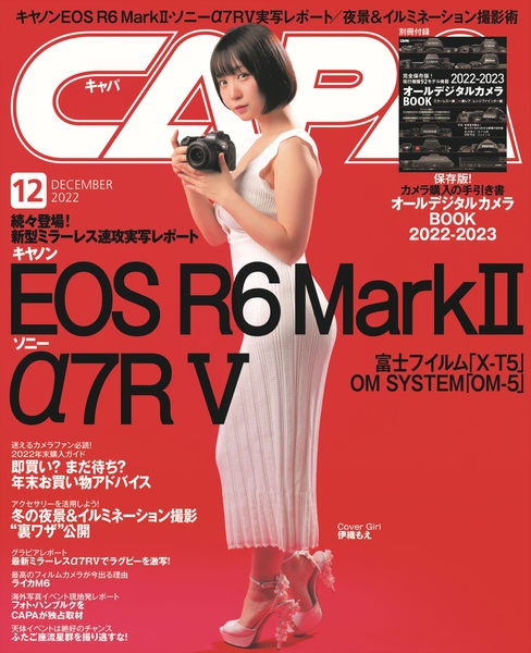 巻頭特集は「年末大特集! 新製品2022Late」と題し、今秋登場&発表のキヤノンEOS R6 MarkⅡやソニーα7RⅤなど注目モデルをいち早くレポート。第2特集は各メーカーの人気機種購入の決断ポイントをズバリ解説する「どちらを選ぶ? 2022年末カメラ購入ガイド」を、撮影テクニックはすっかり冬の被写体となった「夜景&イルミネーションを楽しむ‟裏ワザ”撮影術」をお届けします。さらに今月は、現在販売されているカメラ92製品を網羅した別冊付録「オールデジタルカメラBOOK」付き。CAPA12月号もカメラ・写真を楽しむための記事が満載です。