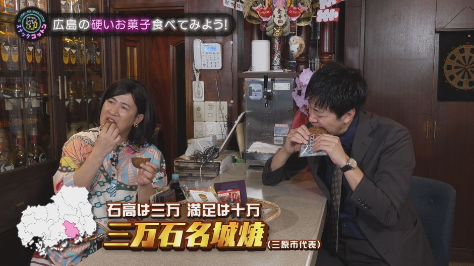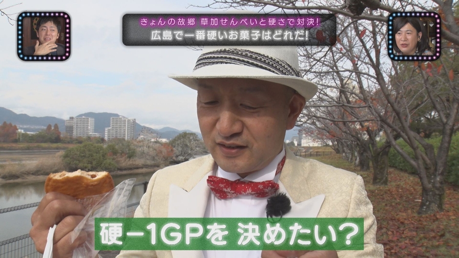 きょんちゃんの出身地・埼玉県草加市の名物と言えば、草加せんべい。日本一の硬さとも称される草加せんべいだが、これに勝る硬さのお菓子が広島にもあるのでは!?ということで、広島県内から銘菓が集結し、硬さNo.1を決める戦いを実施。打倒!草加せんべいをかけた熱戦が繰り広げられる!果たして広島1位の硬さを誇るお菓子とは?そして王者・草加せんべいに勝つことは出来るのか?