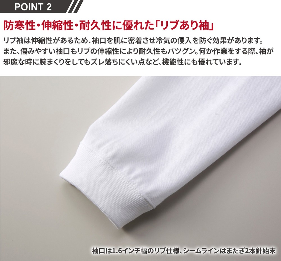 綿100%のロングスリーブタイプ(袖口リブ仕様)です。よれにくく透けにくい上質な一枚に仕上げています。丈夫な首もとを実現するため、首まわりの縫製には「ダブルステッチ」を採用。長年愛用いただいてもきちんとした首まわりを保ちます。