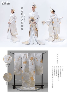 長寿の縁起物として知られる「飛翔鶴」、そして「針松」を全面に配した打掛です。金と銀と織り混ぜ、新郎新婦おふたりの末長い幸せを祈るという意味を込めています。白無垢でも柄がよくわかるようにと銀地を採用しており、清らかで、気品に満ちたデザインながら、個性あふれる仕上がりになっています。