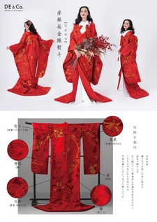 祝いの色とされる「赤」をベースに、金糸の刺繍が織り混ざる一着は、どの角度から見ても目を引くインパクト。現代的でありながら、柄には「熨斗」「鳳凰」「菊」「椿」「檜扇」「牡丹」という縁起のいいモチーフを使用し、古式ゆかしい伝統の美しさも大事にしています。
