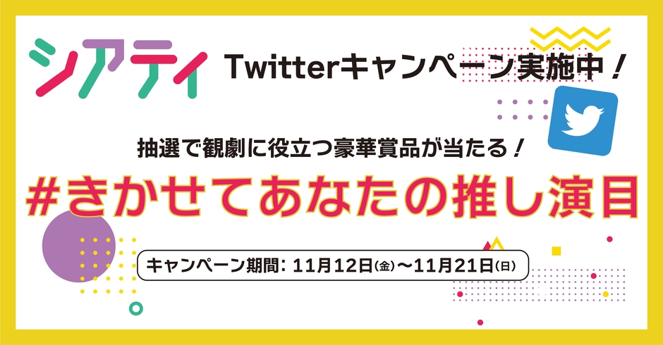 シアティを使ってTwitter上に“推し演目”をシェアすると、抽選で7名様に観劇に役立つグッズやAmazonギフト券が当たります。