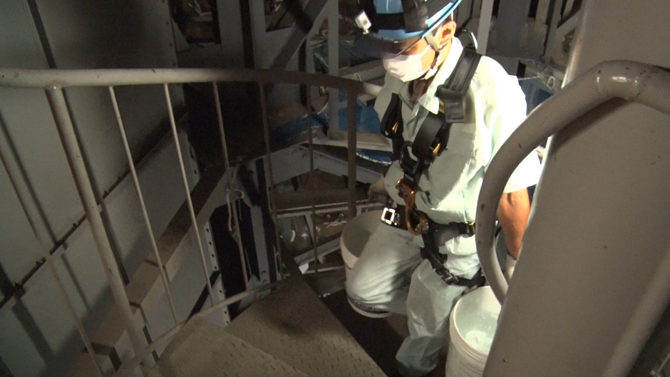 25年間に渡って牛久大仏の清掃を手掛けてきた田口さんと相方の箕輪さん。重さ20キロの高圧洗浄機、命綱に使う長いロープ、洗浄用の水など、たった2人で約150キロの大荷物を大仏の上まで運ばなければなりません。まずは大仏内部にあるエレベーターで胸の高さにあたる展望台まで運びます。それより上へはエレベーターがないため、25メートル上の“目”の裏側部分へとらせん階段を使って移動します。田口さんは今年で50歳。「年々この作業がきつくなってきた」と言います。4往復して荷物を運びきりました。