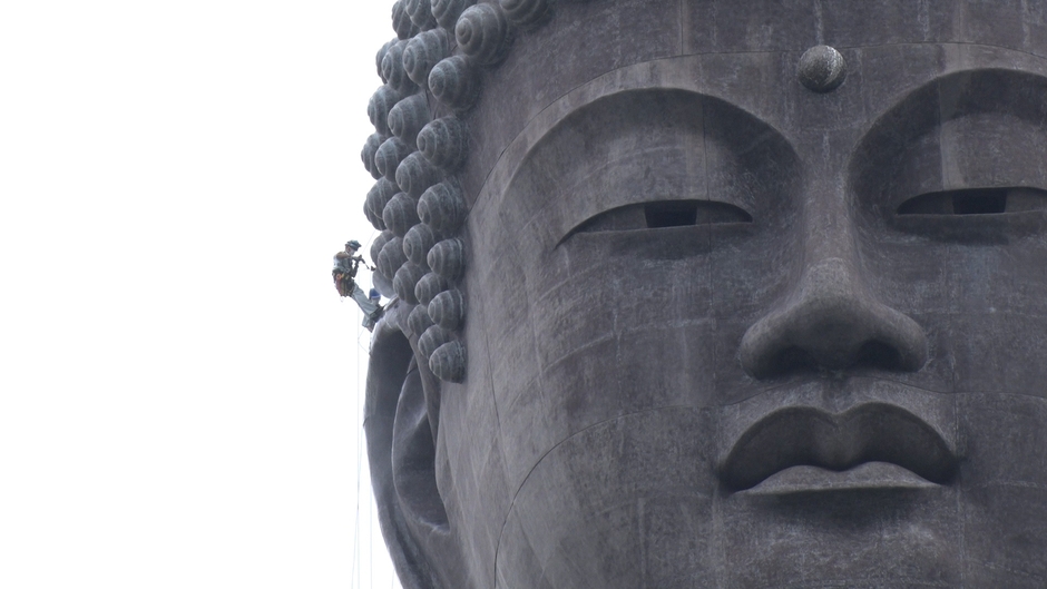 大仏完成以来28年間手付かずだった右耳の清掃では、大仏の頭頂部から右耳へとロープだけで移動する田口さんの姿が・・・。この日は早朝雨が降ったため、足場が滑りやすくなっており、危険度はさらに上がっています・・・