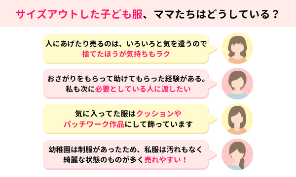 といった声も。きょうだいや友人の子どものために取っておくだけでなく、子ども服を何らかの形で残すママたちの姿が印象的です。