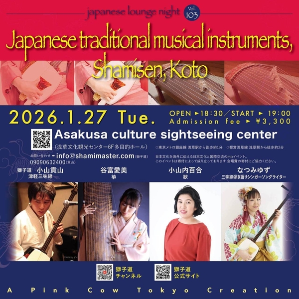 株式会社獅子道(Shishido Inc.、所在地:東京都新宿区、代表取締役:宍戸 俊信)は、インバウンドの聖地・浅草にて、津軽三味線と箏(琴)でロックを奏でるライブ公演「Asakusa: Rock music by Japanese Traditional Instruments(Japanese Lounge Night)」を定期開催、及び同会場にて初心者・外国人向けの「津軽三味線ワークショップ」を開催いたします。
