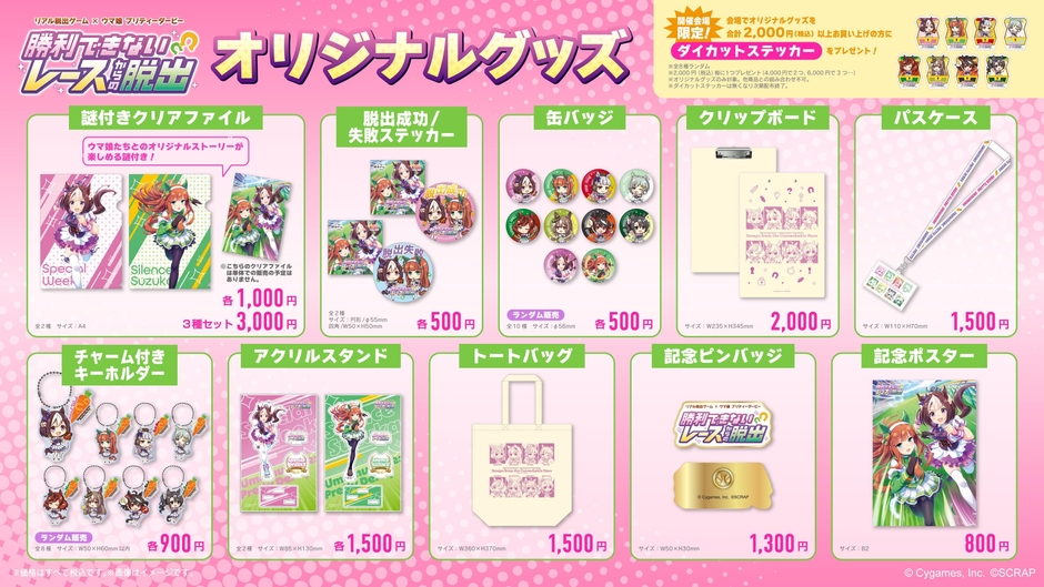 オリジナルグッズは『勝利できないレースからの脱出』開催会場及びCygamesの公式オンラインショップCyStore(https://cystore.com/)にて販売いたします。