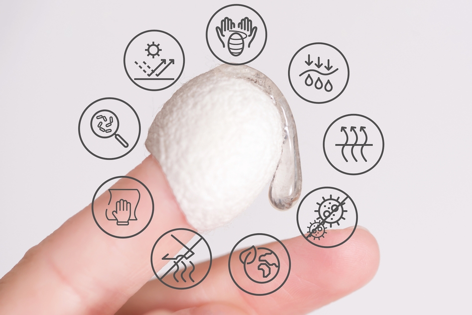 シルクは医療用縫合糸として、2500年前から使用される程に人体との親和性が高いとされています。またシルクのたんぱく質(フィブロイン)は、人がもともと持っている皮膚の保湿成分とのバランスが似ており、肌への親和性が高くなっています。その他にも、吸湿性/透湿性・UV効果・細胞の遊走性などの機能があります。*記載はシルクの性質についてのことです。