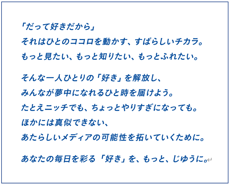 開局当初の局キャッチコピー「じゆうに見よう」をアップデートし、下記ステートメントのように、ステークホルダーの皆様に向けて当社の姿勢と意思を表現したものです。