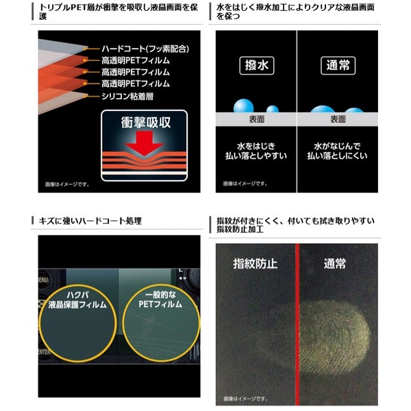 耐ショック・防水モデルのデジカメに適した「耐衝撃」「撥水」液晶保護フィルム。トリプルPET層が衝撃や傷から液晶画面を守ります。表面には撥水、指紋防止、抗菌、ハードコート加工、粘着面はバブルレスタイプを採用。