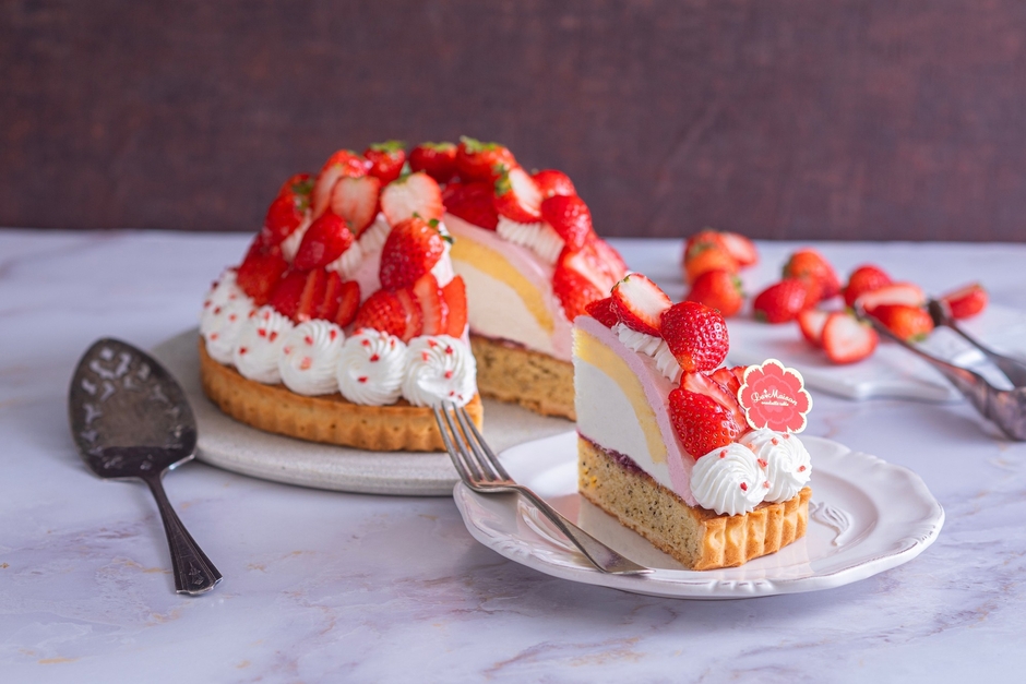 カスタードタルトにベリークリームを重ね、ほのかにローズ香るチェリーベリージュレをしのばせました。カーネーションといちごを贅沢に飾り、ブーケにみたてた母の日限定タルトです。