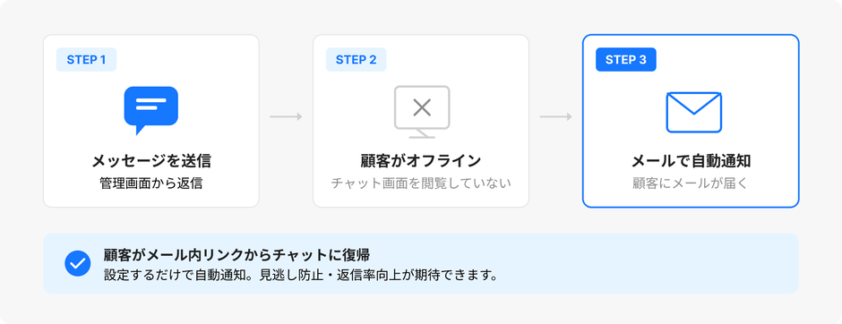 本機能は、顧客がチャット画面を閉じている状態でもメッセージの見逃しを防ぐことを目的としています。これにより、事業者と顧客のコミュニケーションがよりスムーズになり、対応の遅れや機会損失の防止につながります。